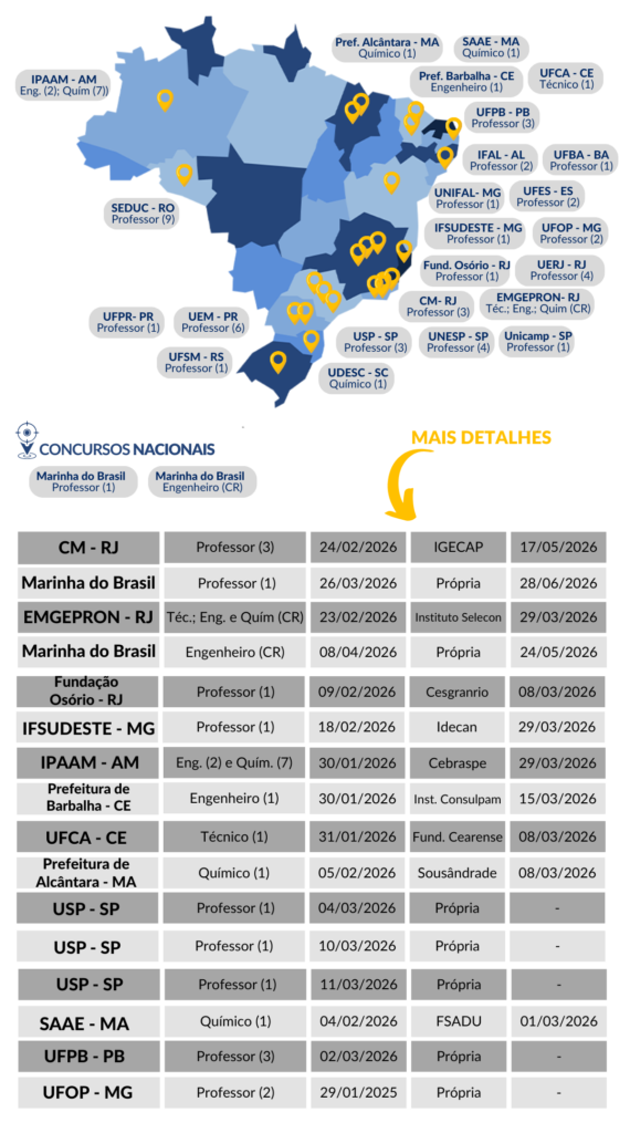 No mapa abaixo e na tabela que o acompanha, estão listadas os principais concursos para profissionais da química com inscrições abertas. Além da remuneração em si, é importante considerar o custo de vida da cidade e também se a oportunidade é próxima da sua cidade natal ou em uma região que você gostaria de morar. Eu mesmo (prof. Diego aqui falando), já me arrependi de escolhas entre cargos que fiz baseado apenas na maior remuneração. Portanto, é essencial analisar todas essas variáveis antes de tomar uma decisão.