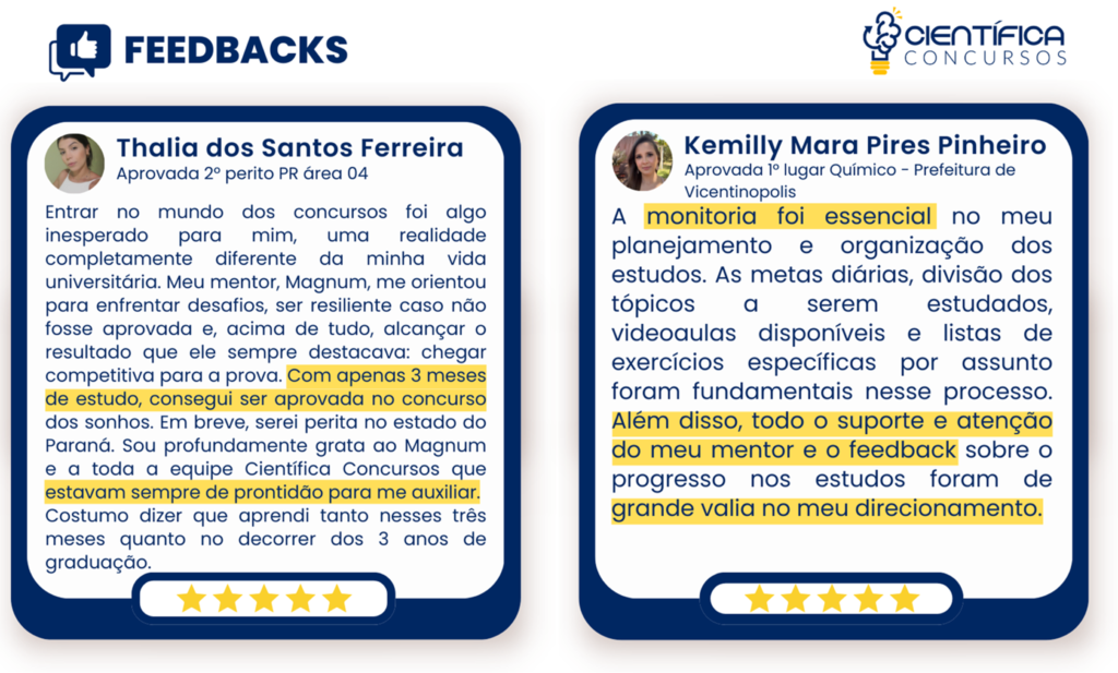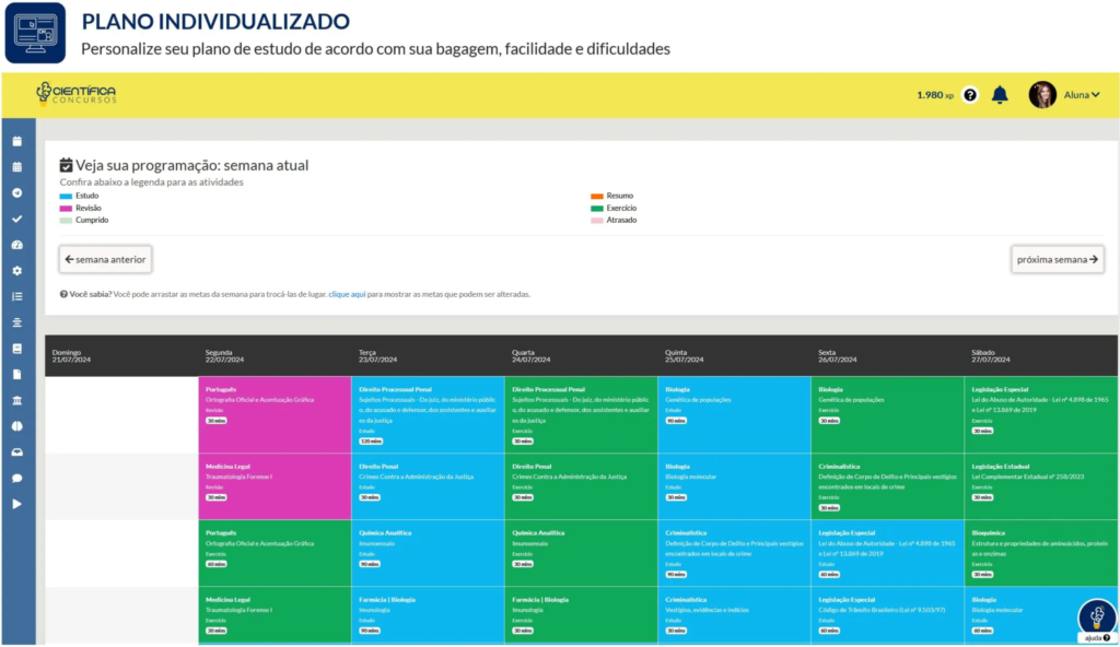 A principal dificuldade está na organização do ciclo sem ferramentas adequadas ou orientação especializada. Por isso, em nossa mentoria e monitoria da Científica Concursos, o aluno recebe um plano de estudos personalizado, com metas diárias, resumos semanais e indicadores de desempenho, sem a necessidade de estruturar tudo sozinho. O planejamento pode ser ajustado conforme prioridades, dificuldades e estatísticas de desempenho.