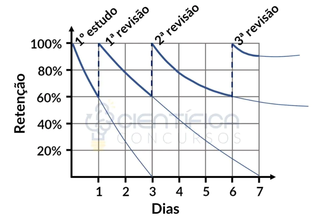 De preferência, aplique ciclos de estudo em seu planejamento. Para entender por que eles funcionam, recorro a um conceito cientificamente comprovado: a curva do esquecimento, proposta pelo psicólogo alemão Hermann Ebbinghaus em 1885 — e reforçada por estudos posteriores que corroboraram a ideia central de que o esquecimento é um processo natural e que a retenção da informação diminui com o passar do tempo.