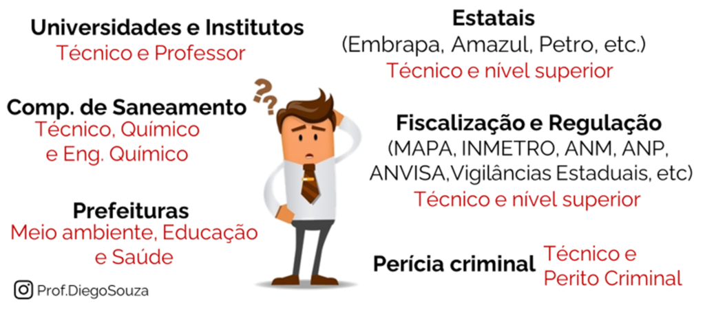 As etapas podem variar um pouco conforme o tipo de cargo e o órgão. De forma geral, os concursos na área de Química se dividem em dois perfis principais: