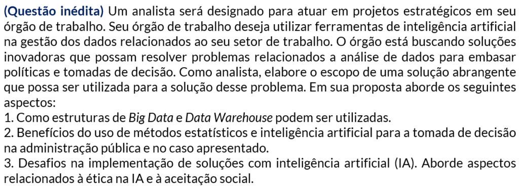 Por fim, para compreender na prática as melhores estratégias de estruturação do estudo de caso — principal aposta para a discursiva do Bloco 3 do CNU 2025 — apresentamos a seguir uma questão inédita retirada do nosso preparatório completo para Bloco 3 do CNU. Escolhi uma questão que aborda Big Data e aplicação de ferramentas de Inteligência Artificial (IA) pela contemporaneidade dos assuntos e pertinência para Administração Pública Federal.