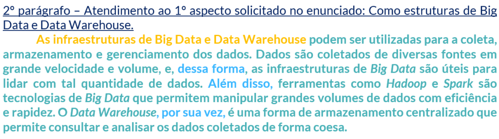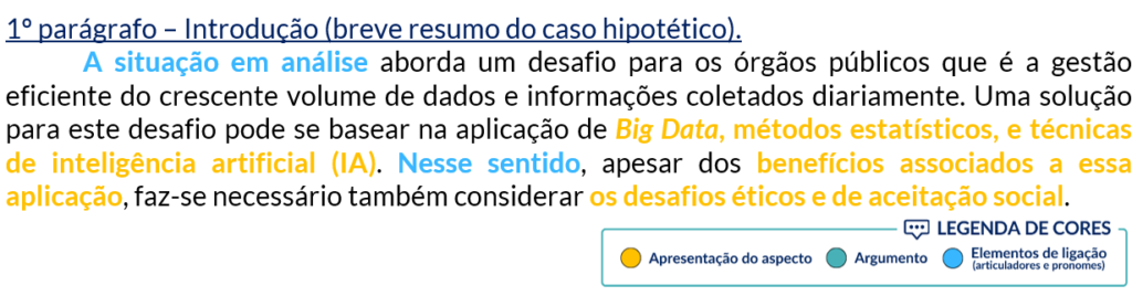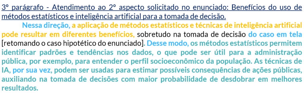 Os parágrafos de desenvolvimento são o núcleo da sua resposta e da maior parte da sua pontuação. Lembre-se disso. É nesse espaço que você precisa abordar de forma direta os elementos exigidos (chamados também de aspectos ou tópicos) no comando da questão, demonstrando domínio técnico e capacidade de aplicar esse conhecimento ao caso apresentado (lincando, sempre que possível, com o enunciado).