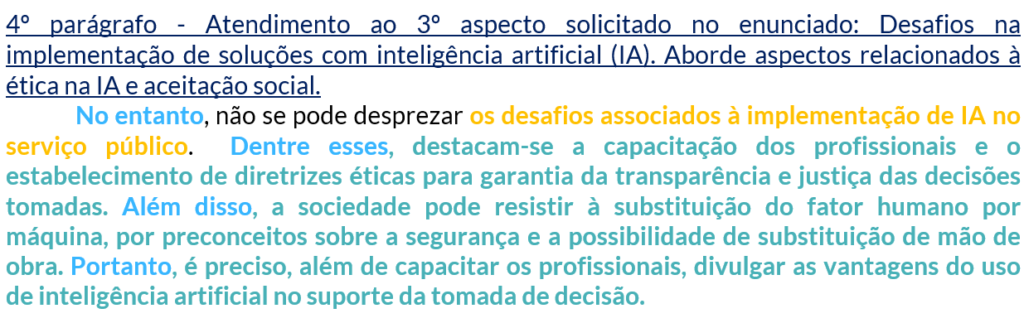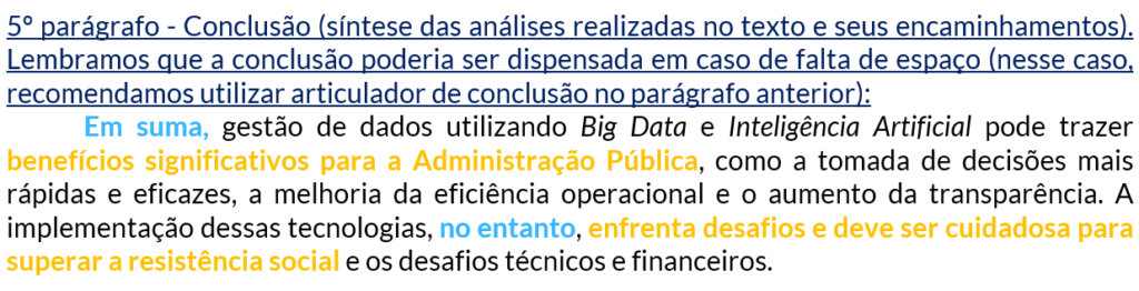 Parágrafo importante para a discursiva Bloco 3 CNU, mas nem sempre a conclusão será possível. Em muitos casos, o último aspecto do enunciado já cumpre o papel de fechamento da resposta — especialmente quando o candidato apresenta encaminhamentos práticos ou resultados esperados. Além disso, o limite de linhas pode tornar inviável acrescentar um parágrafo final sem comprometer o atendimento integral dos tópicos solicitados.
