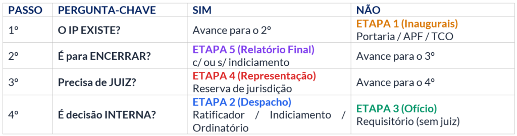 | 5. Conclusivas | Encerram o IP | Relatório Final (com/sem indiciamento, com sugestão de arquivamento) |