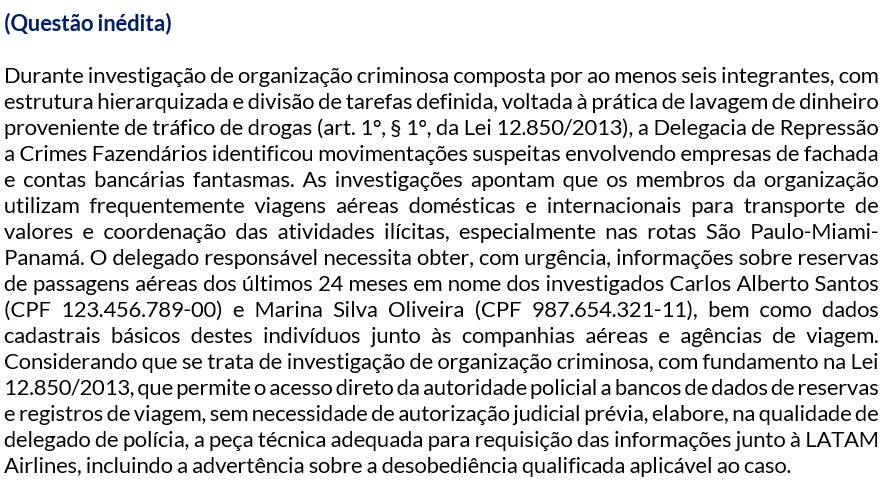 É fundamental que o candidato compreenda, na prática, como preencher cada um dos 8 blocos de forma concreta, adaptando a estrutura ao caso específico do enunciado. E para ficar ainda mais didático, vamos fazer isso agora mesmo, com a mão na massa, resolvendo uma questão inédita de tema quente para o concurso de Delegado da PCDF.