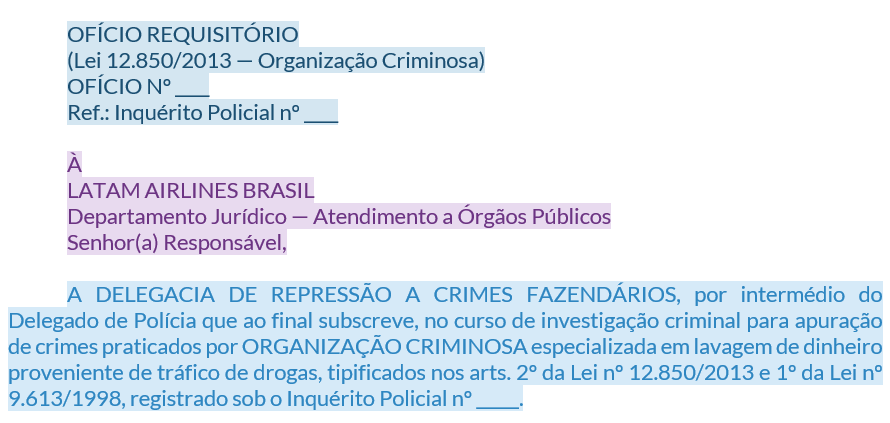 | Organização criminosa, ORCRIM, dados cadastrais, reservas de viagem | Ofício requisitório — Lei 12.850/13 (requisitória) |