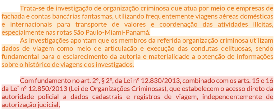 E por que não precisa de juiz? Porque estamos diante de investigação de organização criminosa (Lei 12.850/13), cujos arts. 15 e 16 autorizam o acesso direto da autoridade policial a dados cadastrais e registros de viagem — sem necessidade de autorização judicial.
