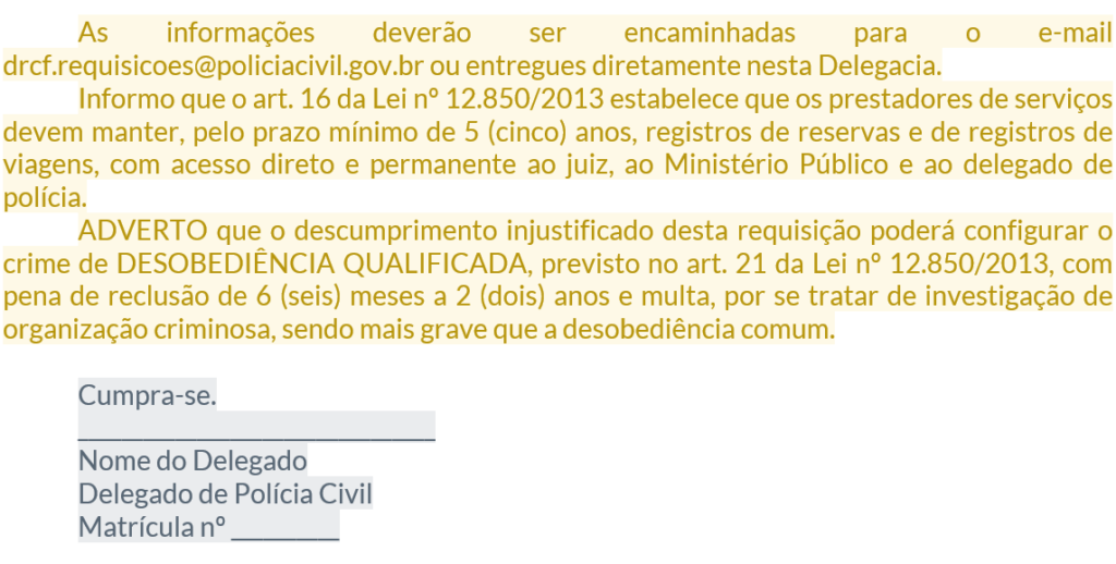 - Base geral: Art. 2º, §2º, Lei 12.830/13 (que estabelece a prerrogativa do Delegado de requisitar informações);