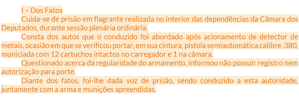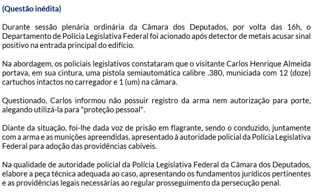 A questão aborda justamente um cenário que conecta as atribuições da Polícia Legislativa Federal com a prática de peça técnica de polícia judiciária: flagrante delito por porte ilegal de arma de fogo nas dependências da Câmara dos Deputados.