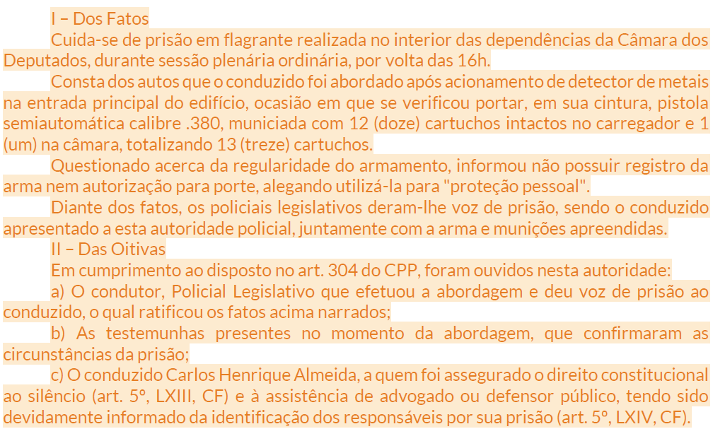2ª Pergunta: Há flagrante?Sim. O conduzido foi surpreendido portando arma de fogo municiada, sem autorização legal, nas dependências da Câmara.