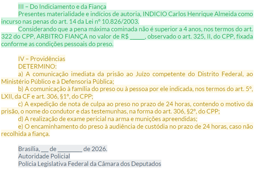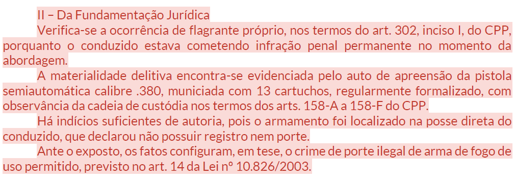 B5 — FundamentaçãoTipificação (art. 14, Lei 10.826) + flagrante próprio (art. 302, I) + materialidade + autoria + fiança cabível