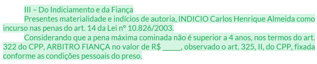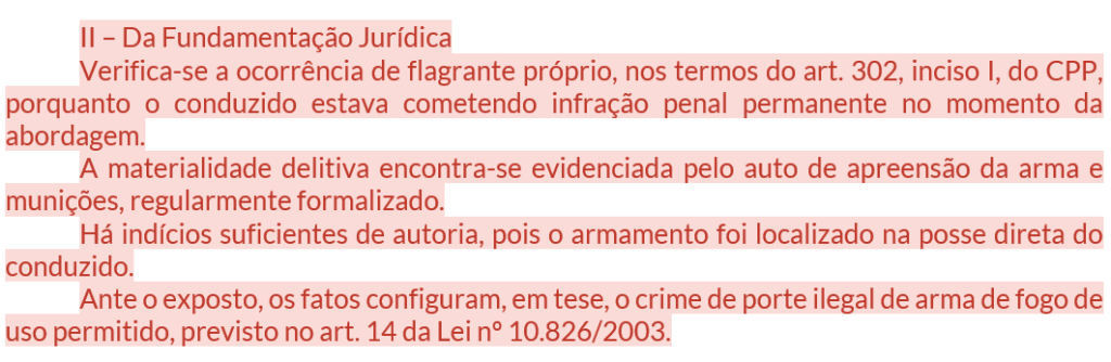 | B5 — Fundamentação | Tipificação (art. 14, Lei 10.826) + flagrante próprio (art. 302, I) + materialidade + autoria + fiança cabível |