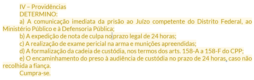 | B7 — Providências | Nota de culpa, comunicações (juiz/MP/Defensoria), perícia na arma, audiência de custódia, fiança |