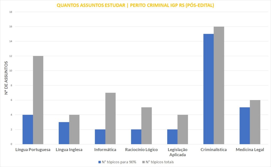 No gráfico abaixo, demonstro o paralelo entre o número de assuntos totais de cada disciplina (barras cinzas) e os número de assuntos (barras azuis) que podem abarcar cerca de 90% da prova. Inicialmente, na parte de Criminalística, Medicina Legal (conhecimentos específicos), poucos tópicos poderiam ficar de fora dos seus estudos. Isso acontece devido ao maior peso destas disciplinas (1,25 pontos por questão). É bem comum que nos concursos de perito com áreas específicas, os conhecimentos específicos tenham um peso muito grande na pontuação da prova.