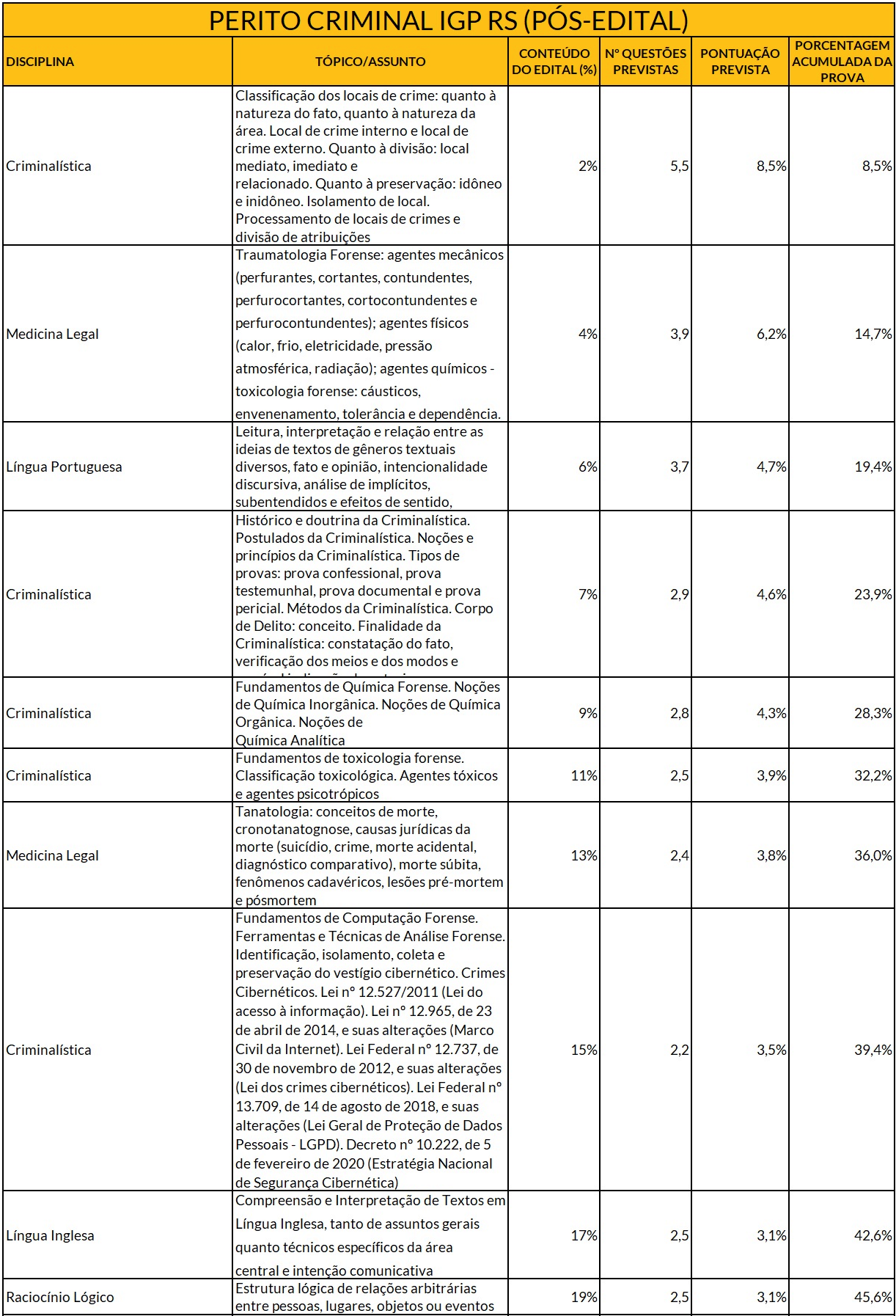 Neste artigo, vamos demonstrar como é possível cobrir 90% das questões da prova com 61% do conteúdo do edital de perito criminal IGP RS. Dessa forma, quem sedimentar o conhecimento dos 33 assuntos mais relevantes entre os 54 totais, atingindo, por exemplo, 80% de acerto, deve garantir nota superior a 58 pontos dos 80 totais o que muito provavelmente levará o candidato para a correção da prova discursiva. Em caso de cronograma apertado ou tempo de estudo muito escasso, vale destacar que cerca de 54% do conteúdo provavelmente cobrirá 85% das questões.