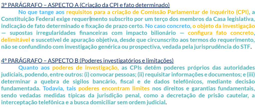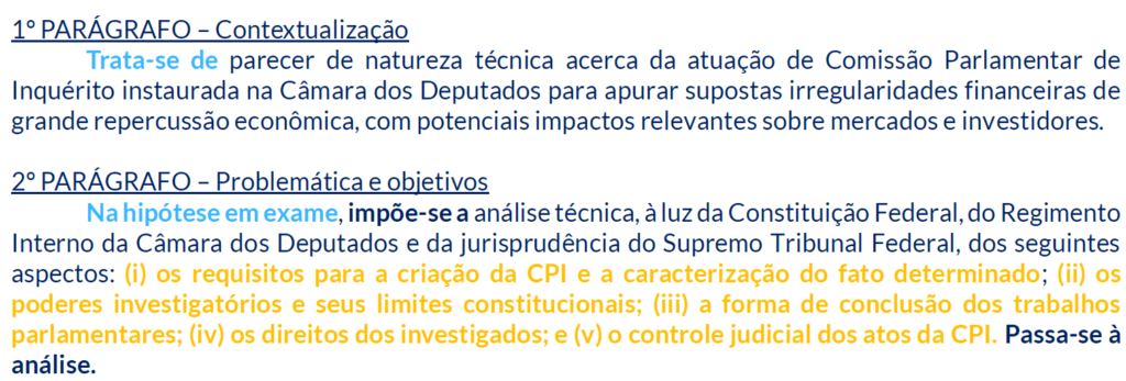 Observe que o primeiro parágrafo identifica tratar-se de parecer técnico sobre atuação de CPI em investigação de irregularidades financeiras. O segundo parágrafo lista os aspectos que serão abordados — os mesmos do enunciado — e faz a ponte para o desenvolvimento.