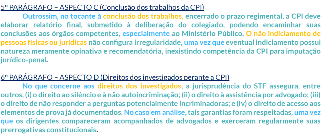 Visualize que cada parágrafo segue o roteiro: apresenta o aspecto, desenvolve com fundamentação na CF/RICD/jurisprudência do STF, e quando cabível, relaciona com os fatos do enunciado (dirigentes invocando direito ao silêncio, impetração de MS, não indiciamento, etc.).