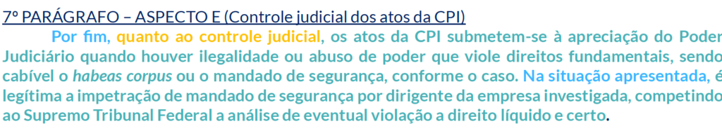 e) Controle judicial dos atos da CPI e cabimento do mandado de segurança.
