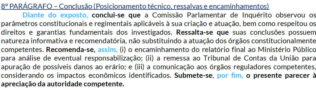 Note que a conclusão apresenta: (1) posicionamento técnico de que a CPI observou os requisitos constitucionais e respeitou garantias fundamentais; (2) recomendações de encaminhamento ao MPF, TCU, Receita Federal e CVM; (3) submissão à análise superior.