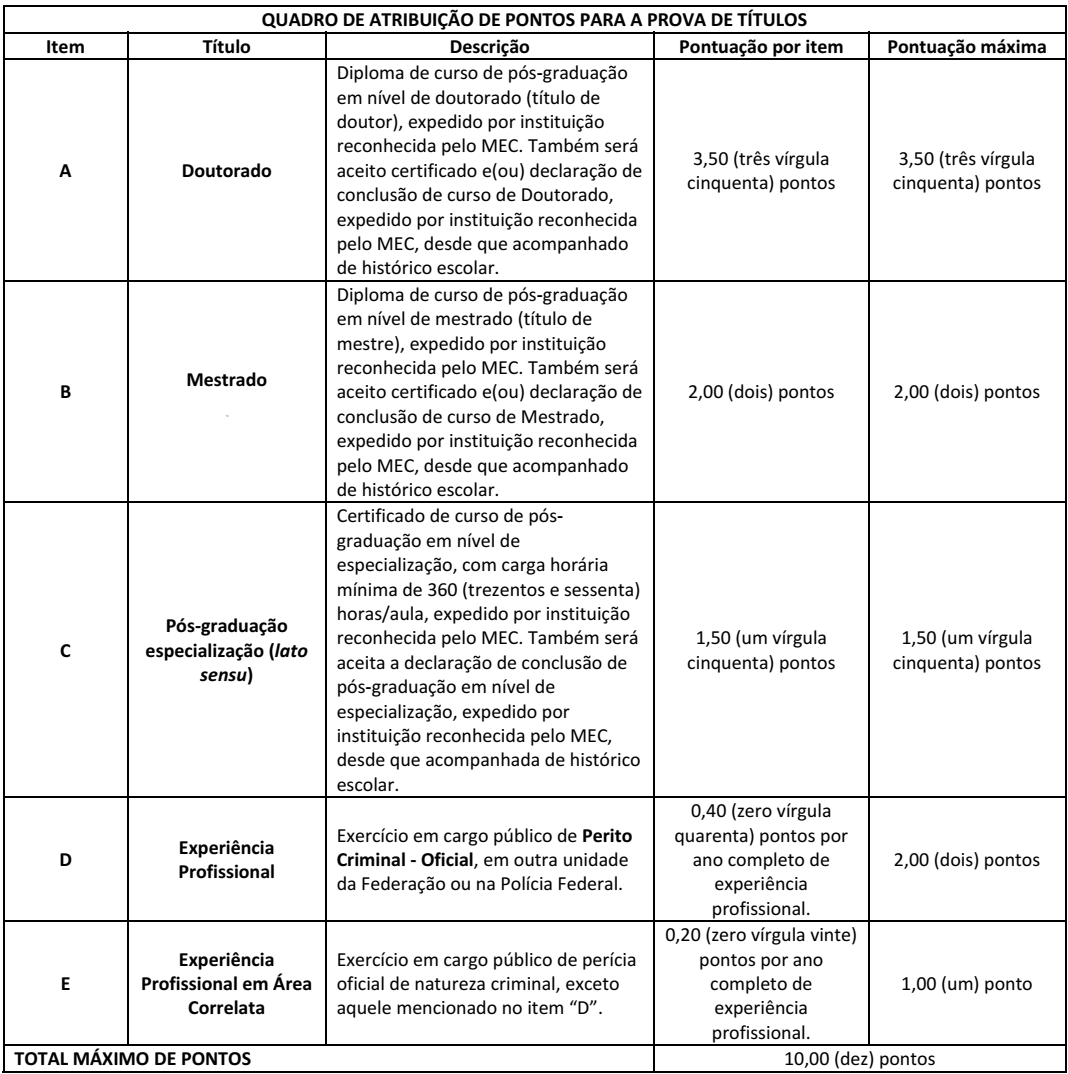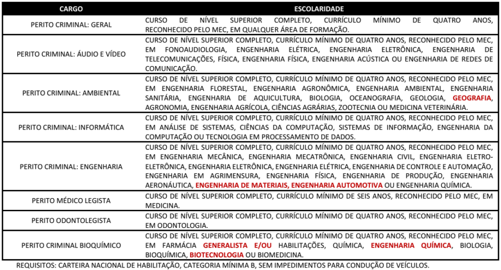 A Prova de Conhecimentos Específicos é específica a cada um dos cargos da carreira de Perito Oficial e terá 40 (quarenta) questões.